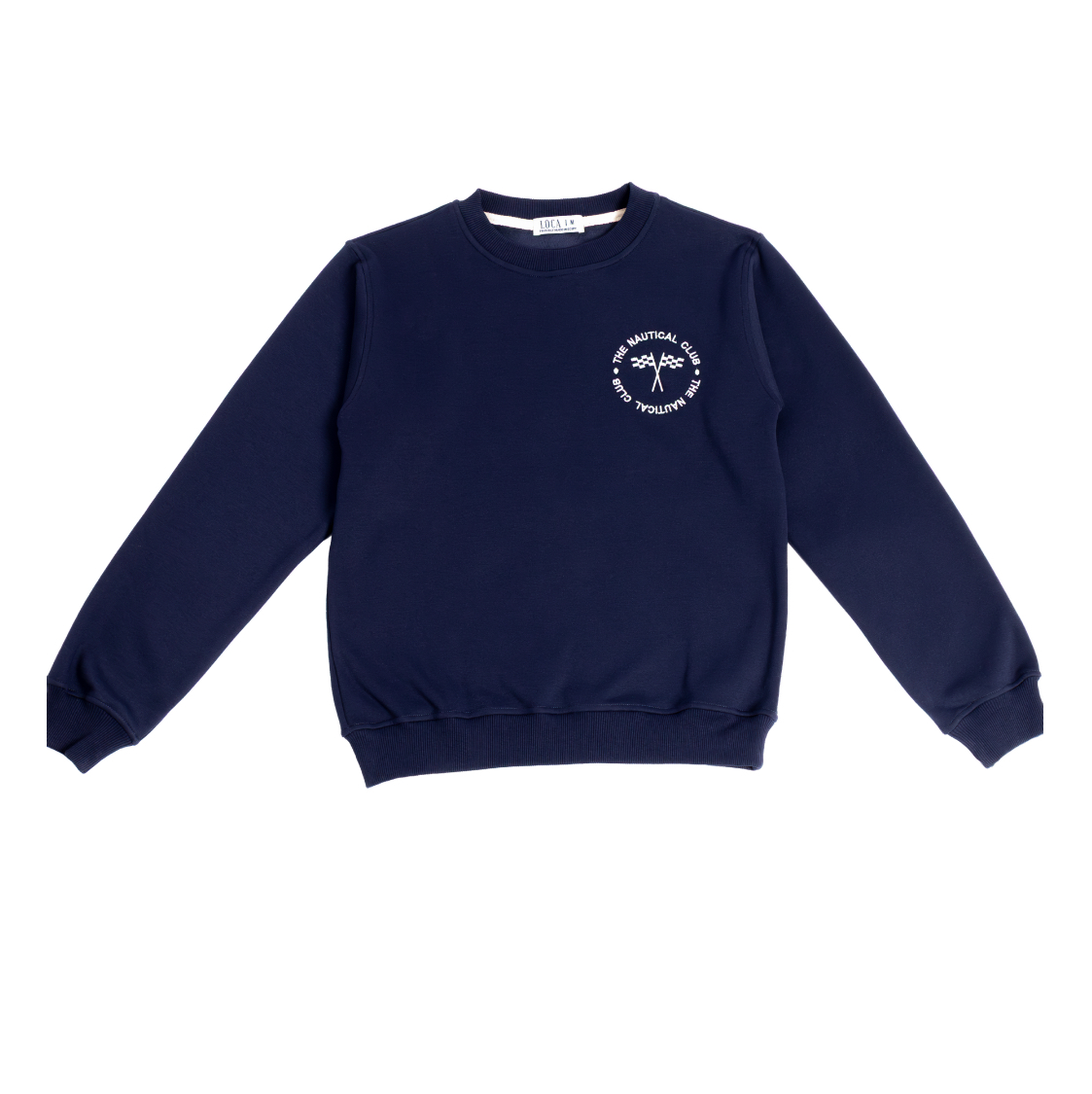 The standout feature is the meticulously embroidered “the nautical club” text, paired with two classic nautical flags positioned neatly on the left chest. The embroidery adds a refined, textured detail that gives the crewneck a timeless, maritime character.